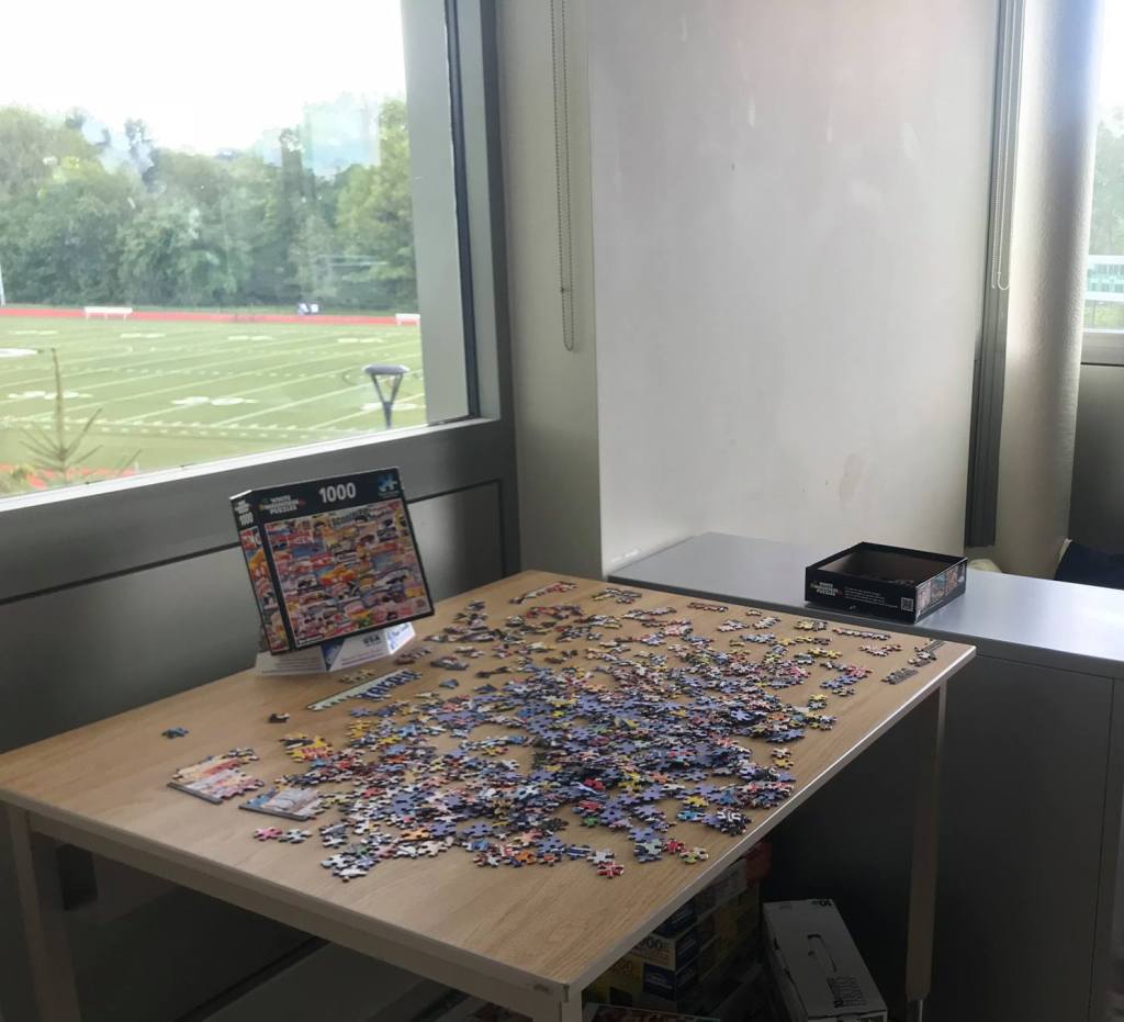 In 2017 during February vacation, I had a sort of epiphany. I love doing jigsaw puzzles at home, especially during the cold winter months when we are nestled inside. For some reason, I thought, “I wonder if I could have a space in my room where I could leave a puzzle out on a table.” Maybe there were others who loved puzzles just as much as I did. If I could just get a table, I would give it a try.
