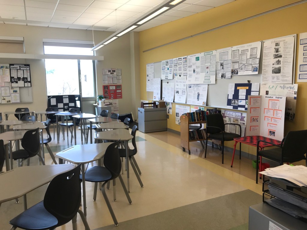 Although I was grateful and excited for this new physical space, it was a bit daunting to figure out where things should go. With that said, some options were limited because of the structure of the classroom itself. There were two places to set up my computer– in the front of the room near the window or in the back corner of the room. I opted for the front. I decided to keep students’ desks in rows, with some minor adjustments such as fewer desks in each row. It was familiar and –at a time when everything else was different– including a new curriculum– familiar was good.
