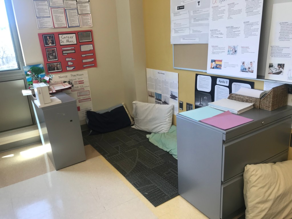 At home that night, I remembered that my sons had had a small rug in their bedroom that they no longer used. My mother-in-law had given it to them years before. It was a “game rug” on which there were bright colors and circles intended for playing marbles. It wasn’t ideal, but it would fit in the space and it was free. I also brought in a couple of pillows and threw them on the floor next to the rug. Before long, it felt like a relaxing space in which to work.