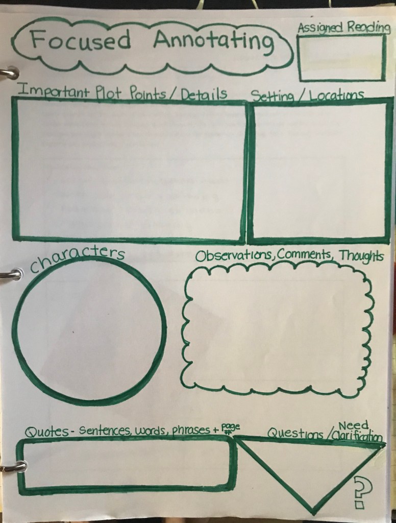 I have also created a variety of simple but helpful note taking sheets, a handout that has physical space for them to quickly record details as they read. The goal isn’t to give them busy work but rather to help them learn to pull out important parts of assigned material. To be honest, the simpler the resource, the more likely it is that they will use it. Also, the simpler the resource, the more likely they will start to create their own resources based on what you have given them. Once they see how it was helpful in your class, they start to create similar resources for other classes. In fact, I have had students show me study materials they have created for other classes, and they are actually proud of them. They have figured out ways to take something simple and replicate that in their other classes.