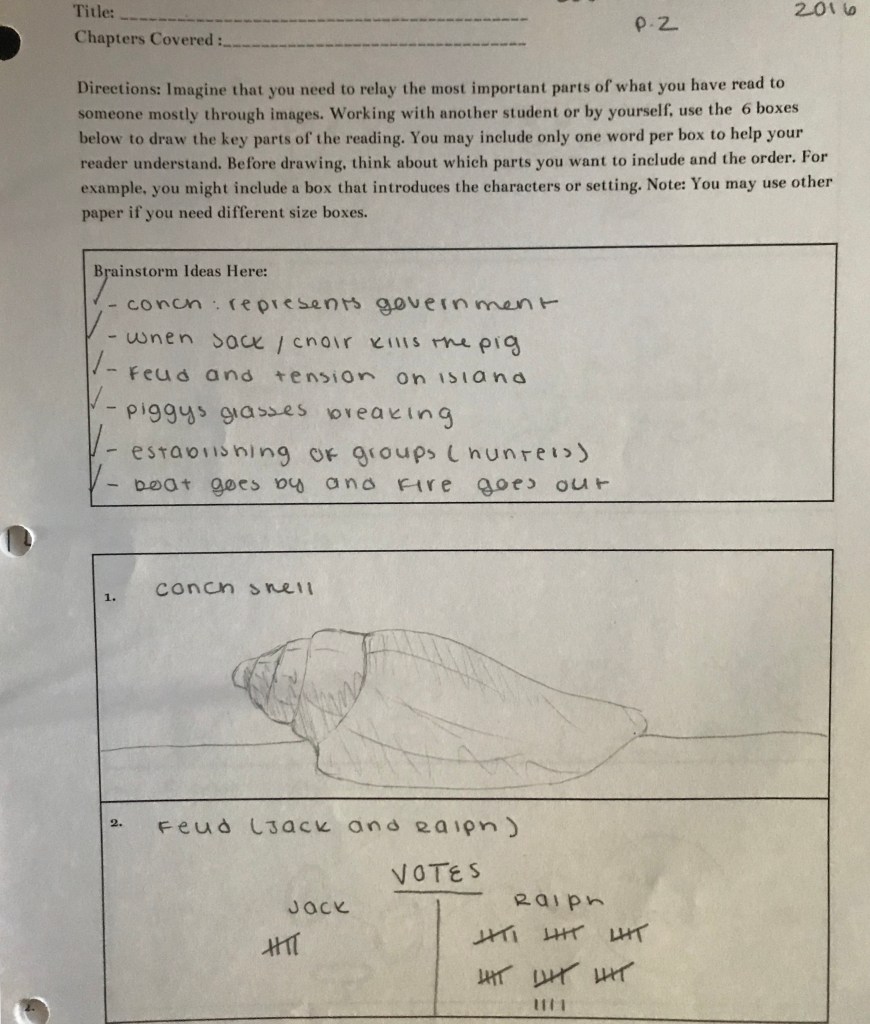These assignments are versatile (work with any type of reading), quick and easy, yet they force them to think about the important details of the assigned material. They are also help me see if they have understood the reading. When I walk around to check their homework, I might ask, “Oh, what’s that?” or “Why did you add that detail?” By listening to the students’ explanations, I can tell not only if they understood the material but any insights they have. For example, in the above Visual Summary, this student’s depiction shows that early in the novel in Lord of the Flies, Ralph was overwhelming elected leader over Jack- a more insightful observation than “The kids voted Ralph to be their leader.”